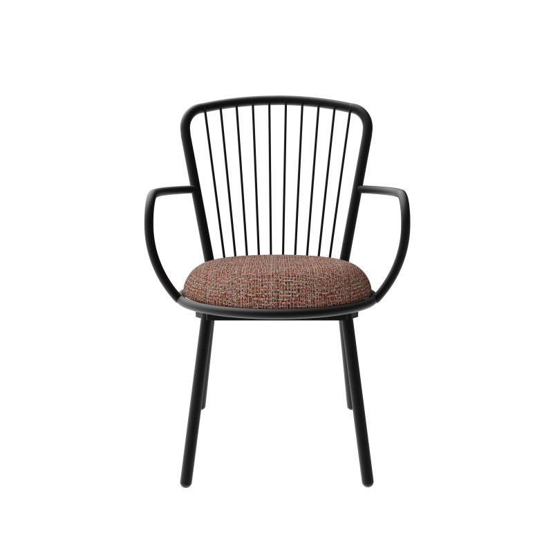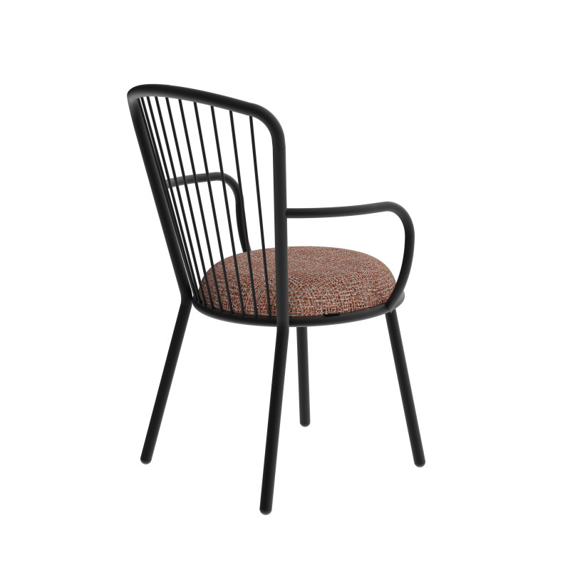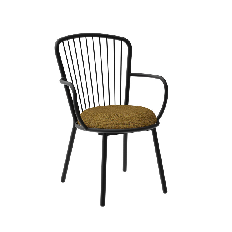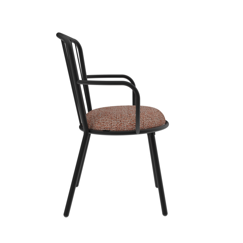 | Ideal finishes | The structure is proposed in black powder coated steel. Our factory has its own painting line: customization is possible. Do not hesitate to contact us. Its dense foam makes it a very comfortable seat. You can find your happiness among 3 categories of fabric : Chinés: 40% acrylic 60% polyester, these fabrics are extremely resistant (Martindale 80 000 turns). Timeless, you can find in one of them a colorful particularity allowing you to match it with your interior. As elegant as they are welcoming, our velvets are 100% polyester. They are very resistant (Martindale 50 000 turns). If you want recycled polyester, choose our 3rd range: Chili fabrics from Gabriel. It is also very resistant (Martindale 60 000 turns), fireproof. A light black thread is added to the color for a perfect match with the black of the steel. |